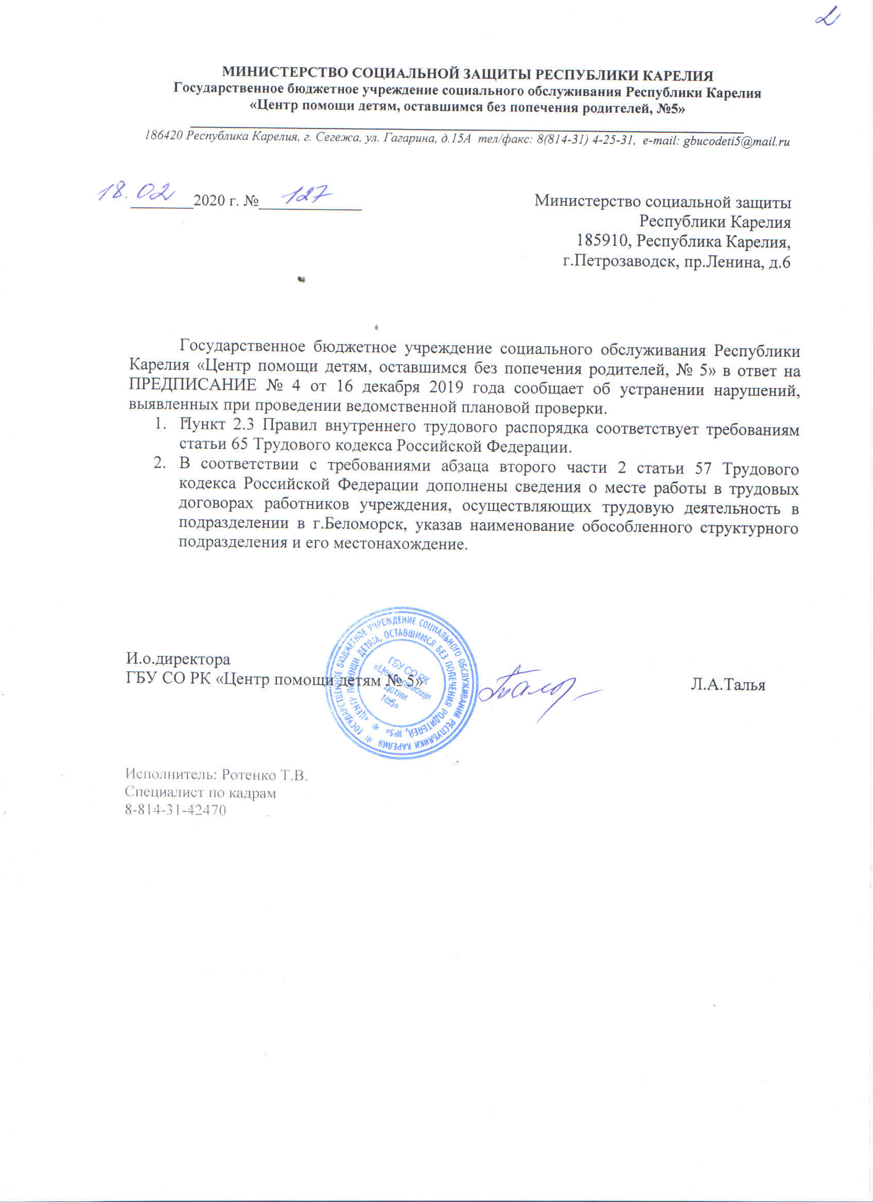 Ответ на предписание № 4 от 16 декабря 2019 года